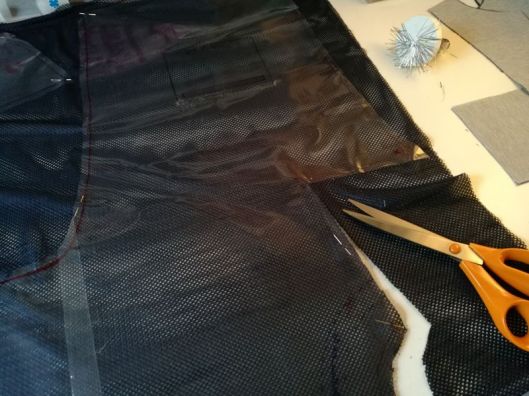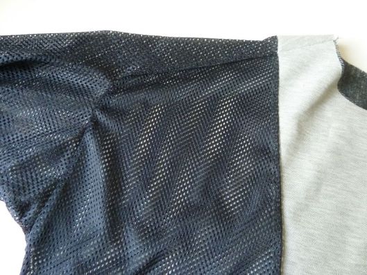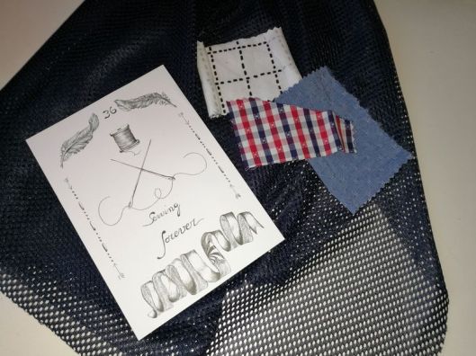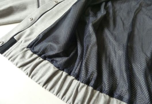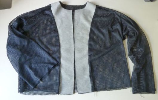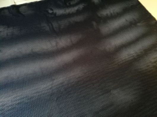 Il s’agit d’un tissu résille bleu marine que j’ai utilisé pour coudre la doublure de ma veste. C’est une doublure ajourée qu’on voit facilement dans les vêtements de sport : le tissu est parfaitement extensible.