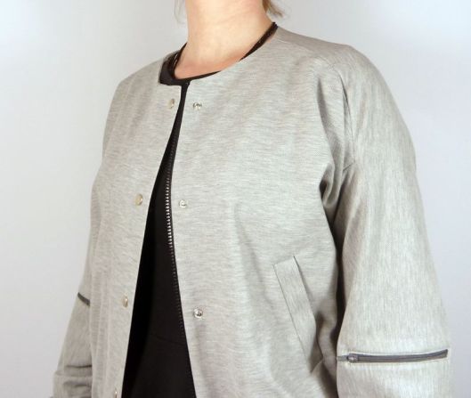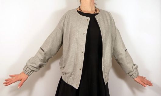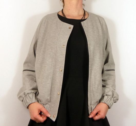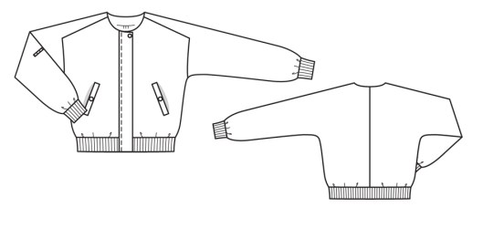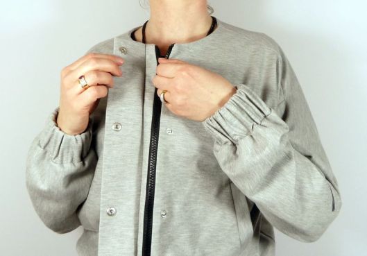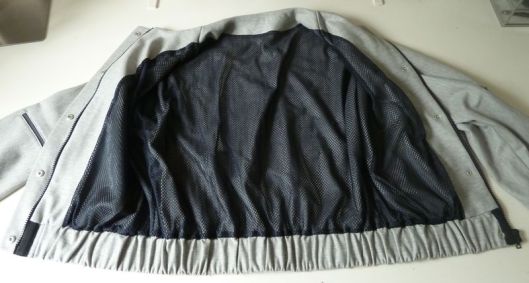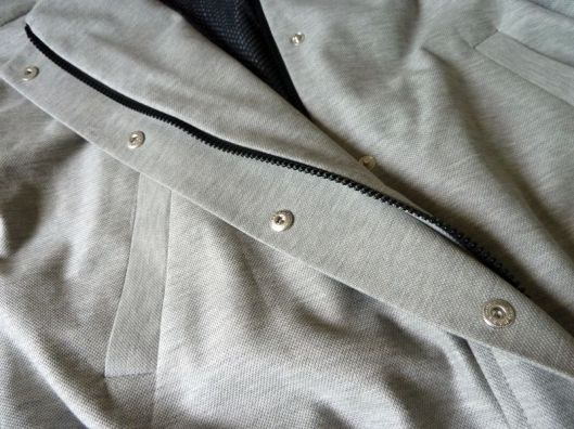 Il s’agit d’une veste-blouson avec une encolure sans col, des poches à 1 passepoil, le milieu devant est zippé avec rabat et pressions. En bas de la veste et des manches il y a du bord côte (dans mon cas j’ai posé des bandes élastiquées). Sur l’une des manches, il y a une poche zippée. La veste ne prévoit pas de doublure (juste des parementures) : pour ma part, j’ai souhaité ajouter une doublure (je vous en parle plus bas !) :