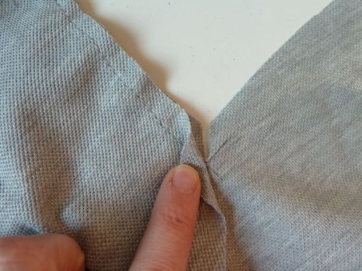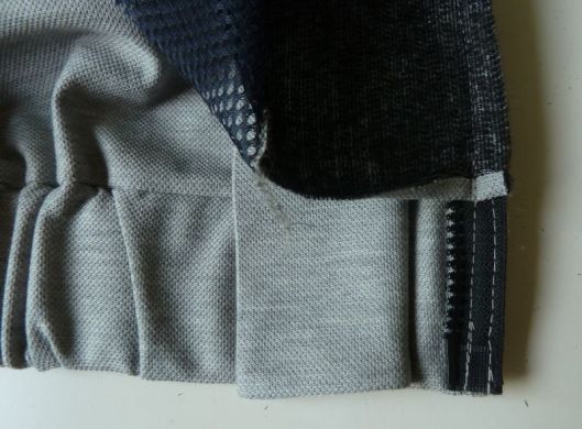 J’ai cousu l’angle (l’incrustation du devant) à la surjeteuse et ça a bien fonctionné :