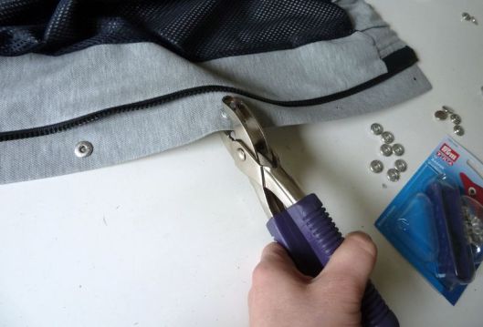 J’ai ensuite posé des boutons-pressions pour anorak selon la méthode expliquée ici.