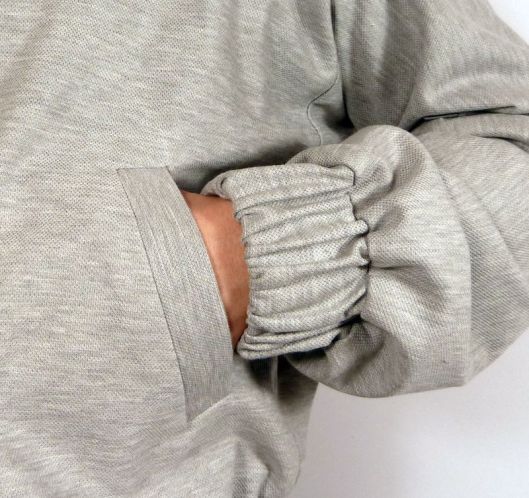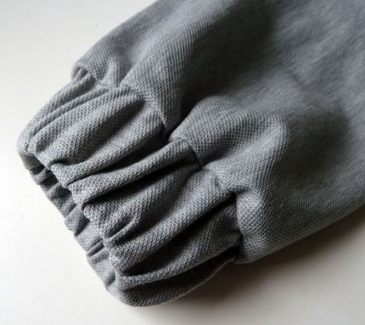 Il est recommandé de poser un bord-côte au bas de la veste ainsi qu’au bas des manches. J’ai pour ma part préféré utilisé le même tissu. Il s’agit donc de bandes élastiquées.
