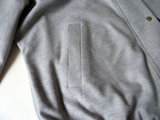 1/ Le patron dit de mettre du thermocollant mais la prof décide de ne pas en mettre et je ne comprends pas pourquoi… C’est pourtant indispensable quand on coud des poches passepoilées par exemple. Idem pour le rabat, les parementures… bref, la veste n’a aucune tenue et ça se voit.