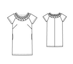 Voici le schéma technique : une robe donc à la base de coupe très simple mais une encolure originale (le dos est en deux parties mais j’ai pour ma part mis la pièce du dos au pli) :