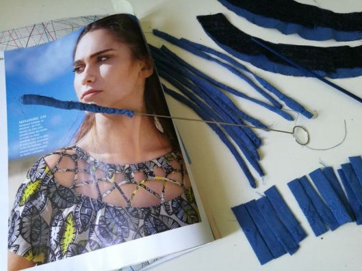 Il est conseillé d’utiliser un gabarit pour s’aider. Pour ma part, je ne m’en suis pas servie. J’ai tout simplement insérer les liens en respectant les croisements. J’ai ensuite fait un essayage et je me suis aperçue que les liens étaient trop grands. Sur la photo ci-dessous, on voit que les liens dépassent de chaque côté d’env. 3,5 cm (que j’ai recoupées ensuite) :