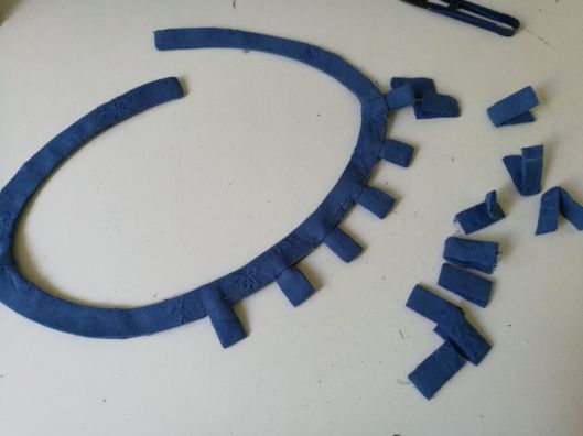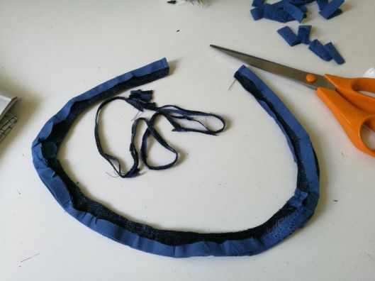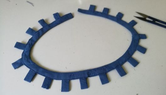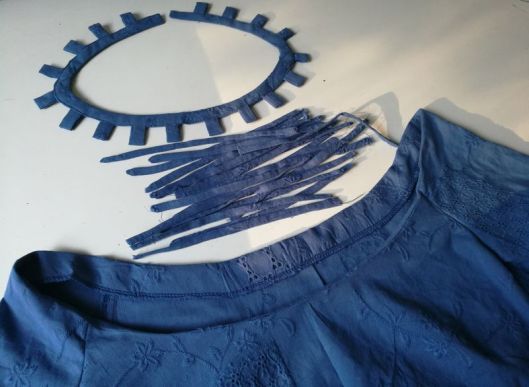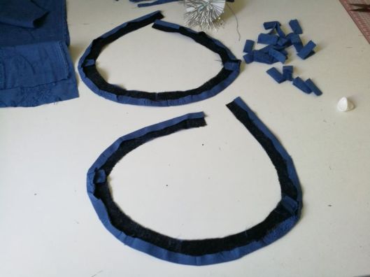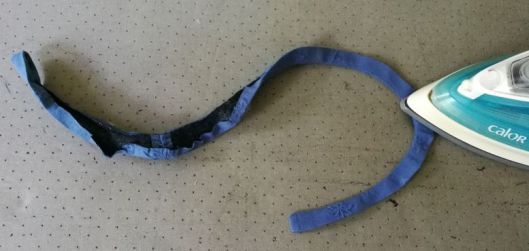 Ci-dessous, on voit mon parement d’encolure et mes passants préalablement cousus et pliés en deux :