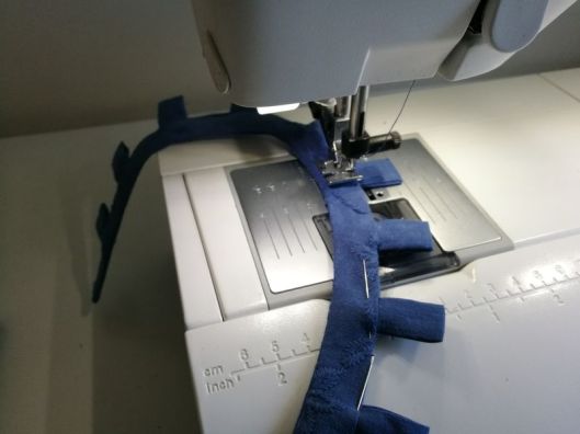 1/ coudre les 20 liens et de les retourner sur l’endroit (prenez votre courage à deux mains, il vous faudra de la patience…)