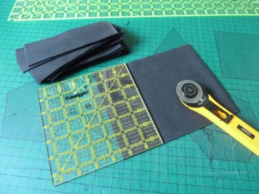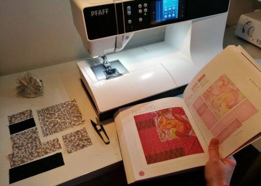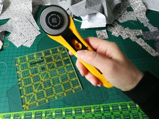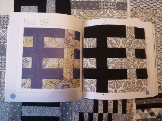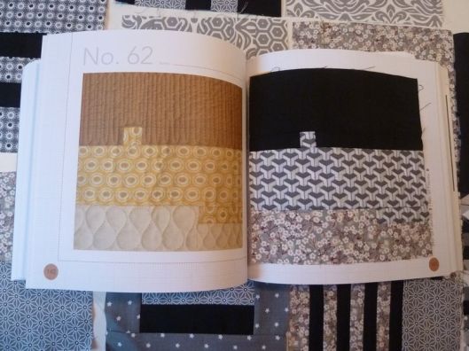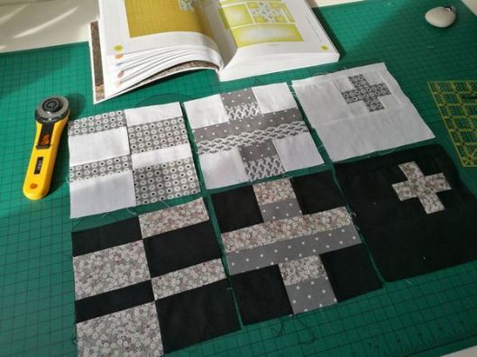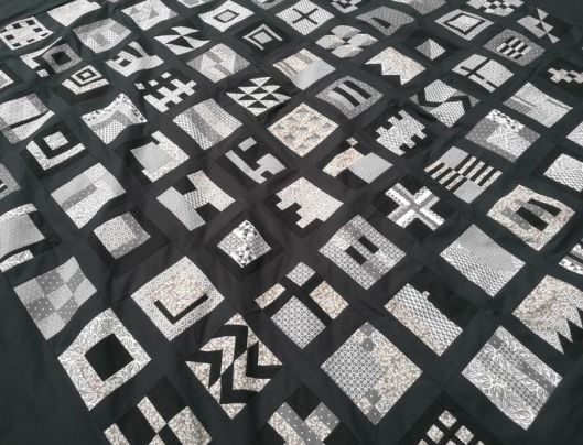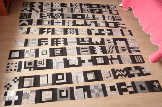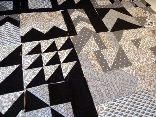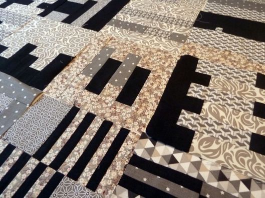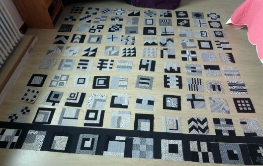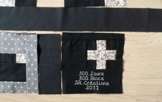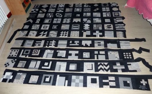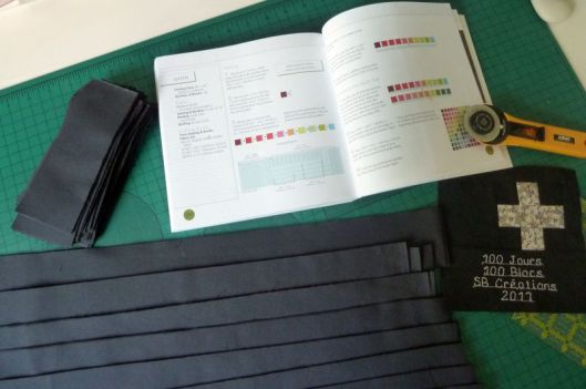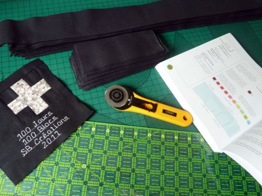 Revenons à nos vrais 100 blocs ! Une fois tous les blocs réalisés, il faut coudre ce qu’on appelle des bandes intermédiaires qui mettront en valeur nos blocs. J’ai pour ma part choisi de découper des bandes noires/grises anthracites.