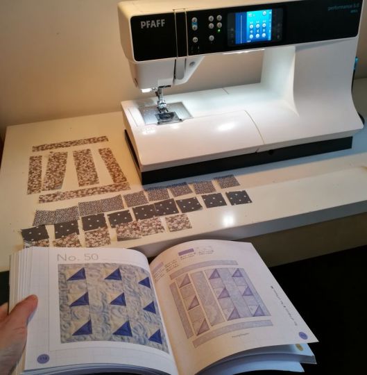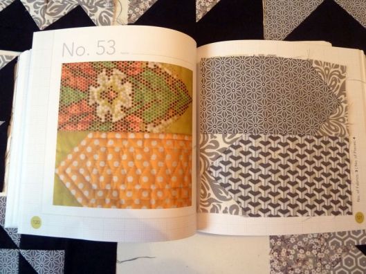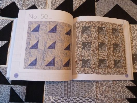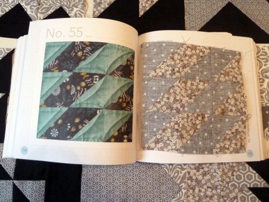 Regardons tout d’abord les blocs 36 à 55 : les triangles ! Il est question dans ce chapitre de la technique pour coudre un carré composé de 2 triangles et des vols d’oies, c’est à dire un rectangle composé de trois triangles. Une fois qu’on a compris le truc, c’est tout bon !