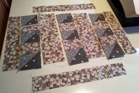Il ne me restait plus qu’à coudre les 4 grandes bandes qui viendront encadrer mes blocs. Je les ai cousues à la maison avec ma machine.