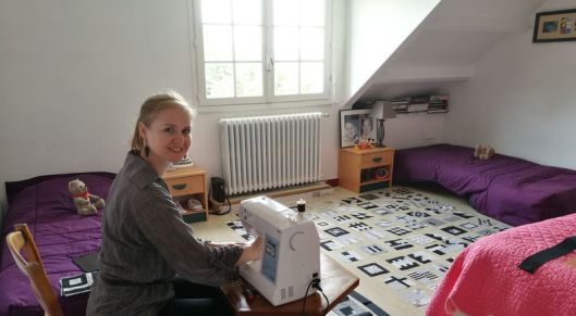 Avant d’assembler mon bloc, il a fallu que je pense à la disposition de tous mes blocs pour que ce soit tout de même harmonieux. N’ayant pas suffisamment d’espace au sol chez moi (il faut tout de même un espace libre de 2m50), je me suis rendue chez mes parents qui habitent à 500 km de chez moi ! Faut dire que j’étais en vacances chez eux, alors autant lier l’utile à l’agréable !