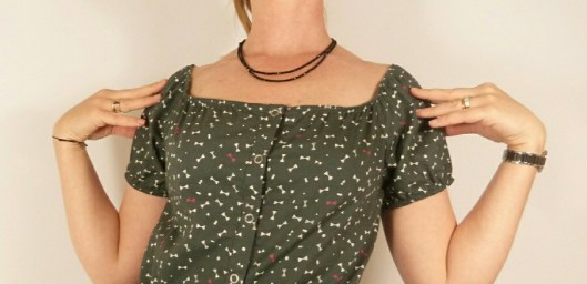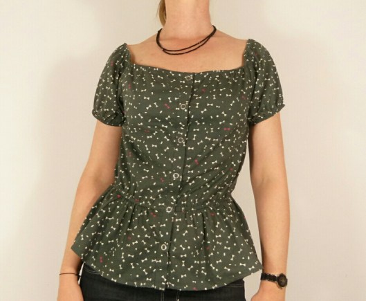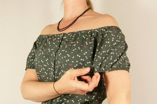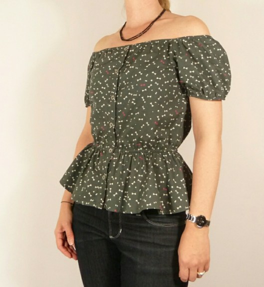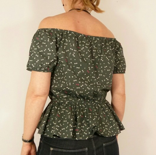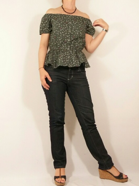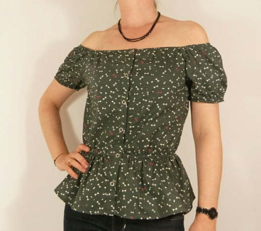 D’après Ottobre, cette blouse est une pièce incontournable de l’été, et j’en suis tout à fait d’accord ! L’encolure est entièrement élastiquée, ce qui permet de porter cette blouse épaules dégagées ou non. La taille et le bas des mancherons sont également élastiqués. Des petits boutons ferment joliment le devant. Il n’y a que 5 pièces à couper et le tout tient dans 90 cm de tissu (pour la taille 36) ! Prévoyez tout de même 1 m de tissu, car ça a été un peu juste pour moi.