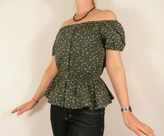 J’adore tout dans ce top : les épaules dégagées, la taille cintrée, la basque froncée, les petites manches ballons et la patte de boutonnage au milieu devant !