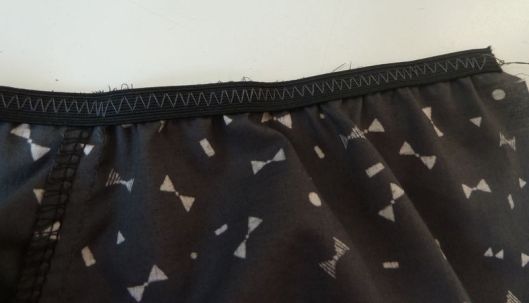 - Piquer l’ourlet en l’étirant de manière régulière (j’ai fait un point zig-zag). Veiller à ce que l’élastique reste bien en place à l’intérieur de l’ourlet.