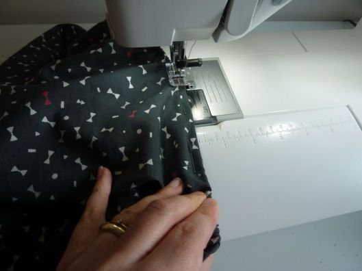 Et on vient piquer le bord supérieur et le bord inférieur de la patte à 1 cm du bord. Il n’est pas utile de dégarnir l’angle car il viendra parfaitement se positionner.