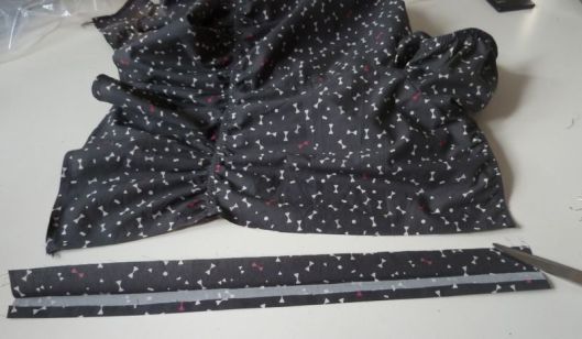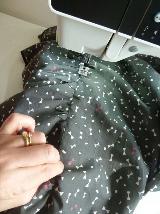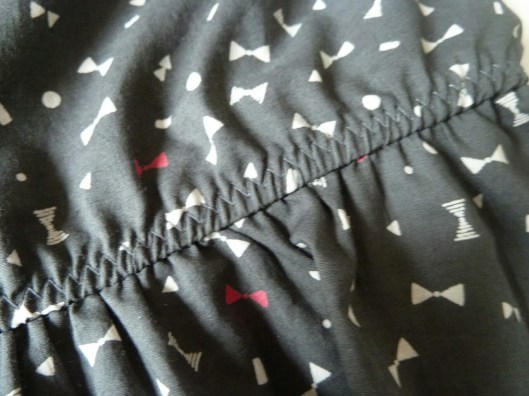Il faut ensuite froncer le haut de cette basque pour que ça s’ajuste au bas du corsage. Une fois, la basque fixée au corsage, on vient surjeter les marges de couture ensemble et on les couche vers le haut en les pressant au fer.