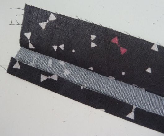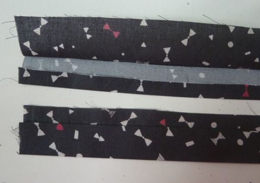 On plie en deux la patte dans le sens de la longueur et on presse au fer. Pour ma part j’ai également presser au fer un ourlet de 1 cm (côté entoilage), ça nous aidera grandement pour la suite.