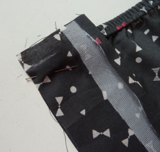 On épingle la patte de boutonnage (endroit – côté sans entoilage) sur l’envers des devants en veillant à laisser dépasser la patte 1 cm en haut et 1 cm en bas :