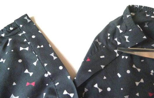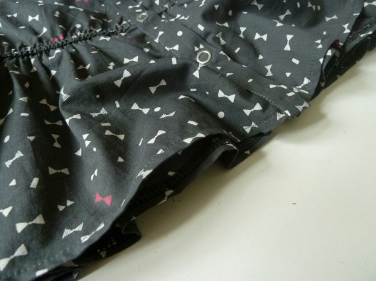 3/ Il y a un problème avec la patte de boutonnage qui est trop petite par rapport au corsage ! J’ai vérifié dans tous les sens : il y a forcément une erreur sur le patron car ça ne s’adapte pas du tout au devant du corsage : le cran qui marque la taille n’est pas placé au bon endroit et la hauteur de la patte est vraiment trop petite en longueur. Pour que ça s’ajuste correctement, j’ai été obligée de réduire la hauteur de la basque. J’aurais préféré redécoupé carrément une nouvelle patte mais je n’avais plus assez de tissu !