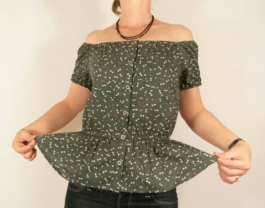 J’adore tout dans ce top : les épaules dégagées, la taille cintrée, la basque froncée, les petites manches ballons et la patte de boutonnage au milieu devant !