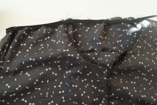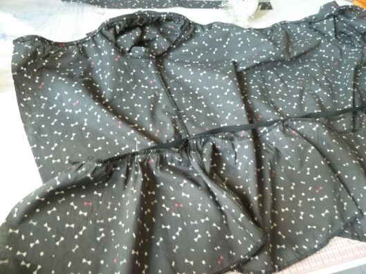 Il faut ensuite froncer le haut de cette basque pour que ça s’ajuste au bas du corsage. Une fois, la basque fixée au corsage, on vient surjeter les marges de couture ensemble et on les couche vers le haut en les pressant au fer.