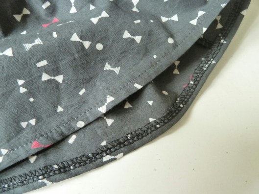 Pour ce qui est de la basque, après avoir cousu le devant au dos, il faut faire l’ourlet inférieur. Pour ma part j’ai surjeté le bas et fait un ourlet simple que j’ai piqué sur l’endroit.