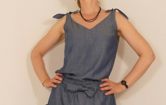 Je dois vous l’avouer, j’ai un peu beaucoup triché ! C’est normalement une combinaison-pantalon que j’aurais du coudre… Mais ce genre de combinaison ne me va pas du tout… Inutile d’insister ! Pourquoi coudre et passer du temps sur un vêtement qu’on sait d’avance qu’on ne portera pas ?! J’ai par ailleurs doublement triché car il ne s’agit pas vraiment d’une combi-jupe car il y a un top et une jupe que j’ai cousus séparément…