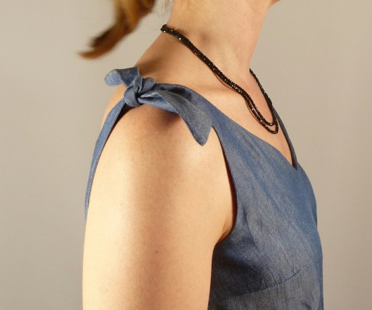 Je n’ai fait aucun ajustement, je porte ce caraco tel que le prévoit le patron. Je trouve toutefois que les pinces et les emmanchures sont trop hautes sur moi. Si je place les pinces au bon endroit, les liens à nouer aux épaules deviennent trop petits… alors…
