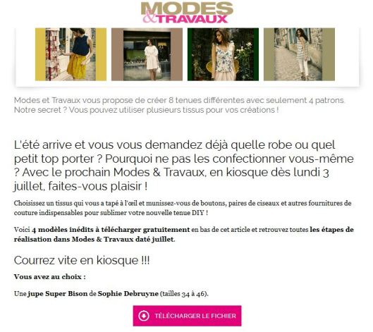 J’ai eu l’idée et l’envie de coudre cette combi-jupe dès que je vu le magazine Modes & travaux qui proposait gratuitement les patrons :