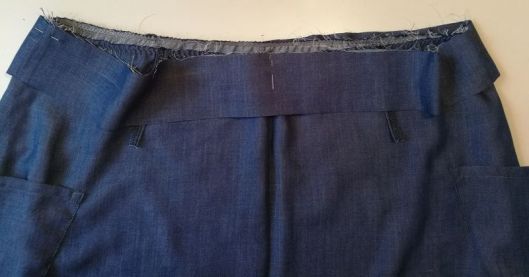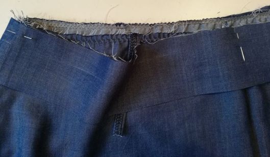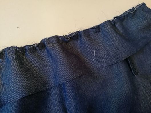 J’ai ensuite cousu les petits côtés de la ceinture puis plié la ceinture en deux : j’ai pressé au fer le pli. On vient ensuite coudre la ceinture (les bords à cru) sur le haut de la jupe :