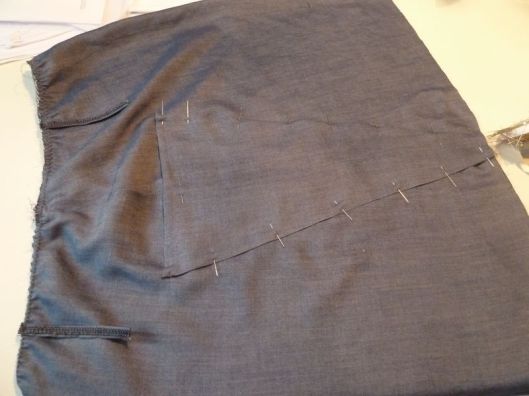 Voici les poches en cours d’épinglage sur la jupe : elles sont cousues à cheval entre le devant et le dos.