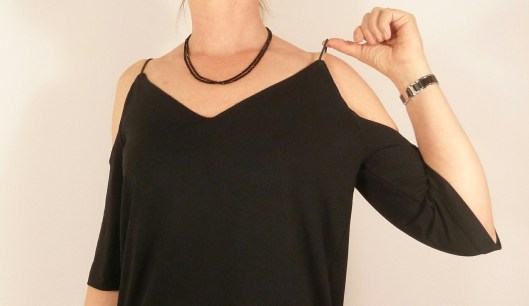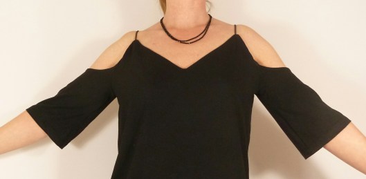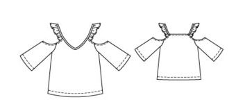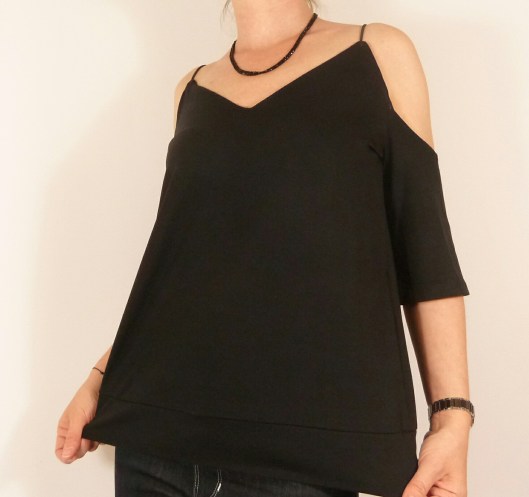 Il s’agit donc d’un top en jersey qui laisse découvrir les épaules : une encolure gansée en V et de fines bretelles garnies d’un ruban froncé :