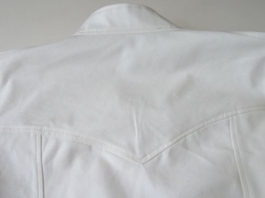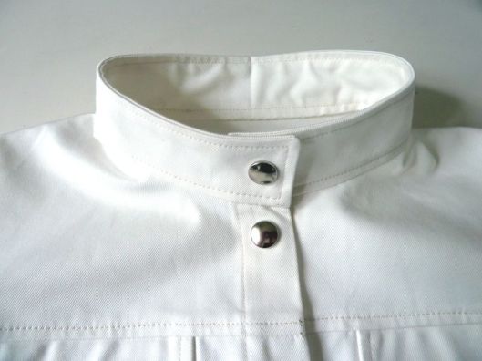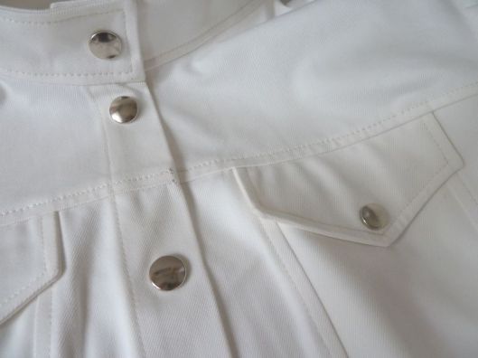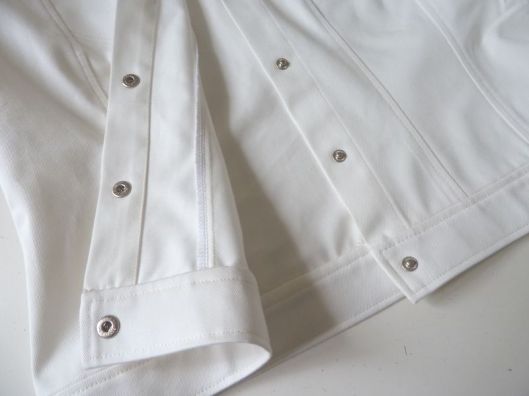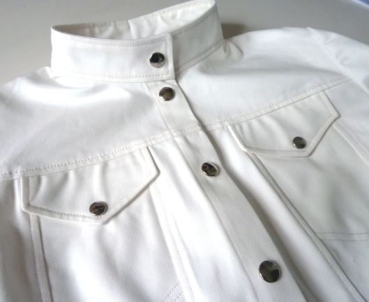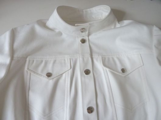 J’ai choisi de réaliser ma veste dans une gabardine de coton blanc cassé que j’ai trouvée en soldes aux coupons de St Pierre.