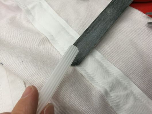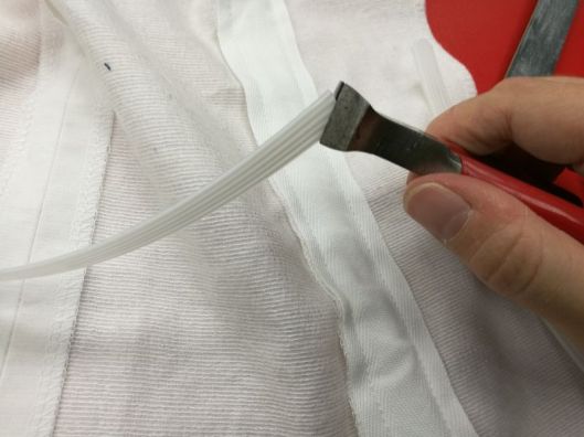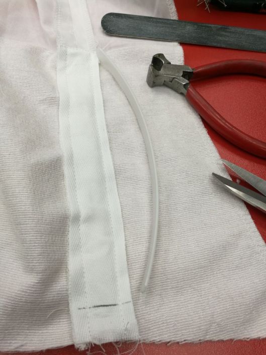 Pour éviter que la baleine ne transperce le sergé, j’ai arrondi les extrémités avec une pince :