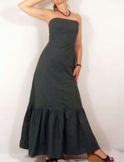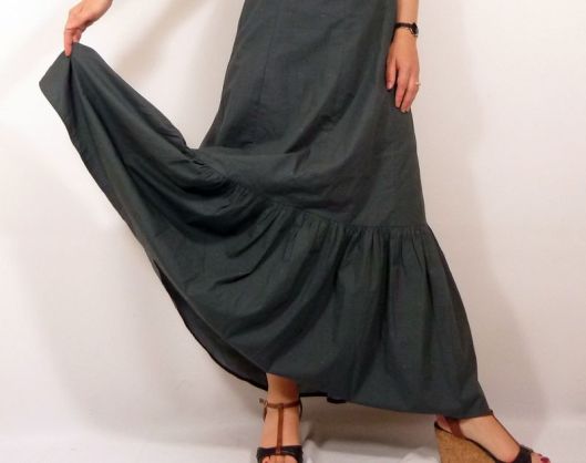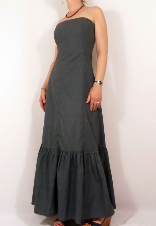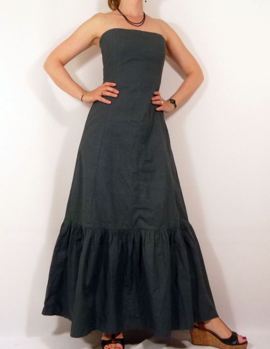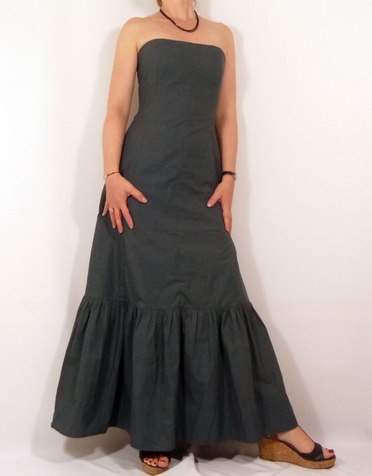 Il s’agit donc à la base d’une robe de mariée que j’ai détournée en robe longue d’été. Côté modifications, je n’ai pas fait le drapé au devant (j’ai donc pris la pièce doublure), j’ai ajouté un rectangle froncé pour donner du volume au bas de la jupe et j’ai déplacé le zip sur le côté : et le résultat me plait beaucoup !