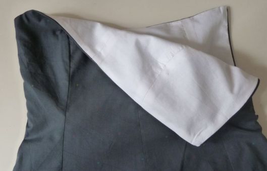 La robe est doublée avec un cotonnade blanche. Pour éviter que la doublure ne se voit sur l’extérieur, j’ai bien entendu fait une sous-piqûre mais j’ai également fait en sorte que le tissu extérieur vienne sur l’intérieur :