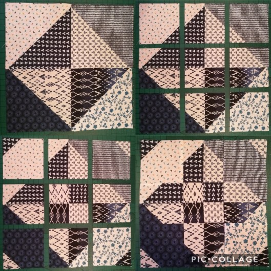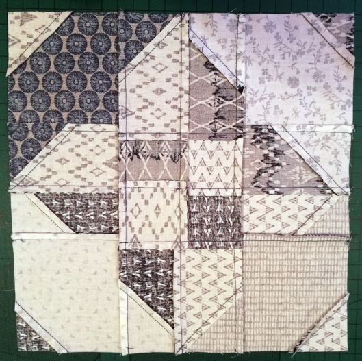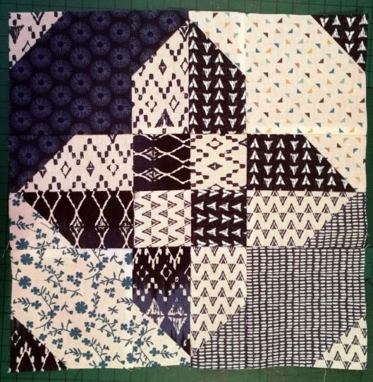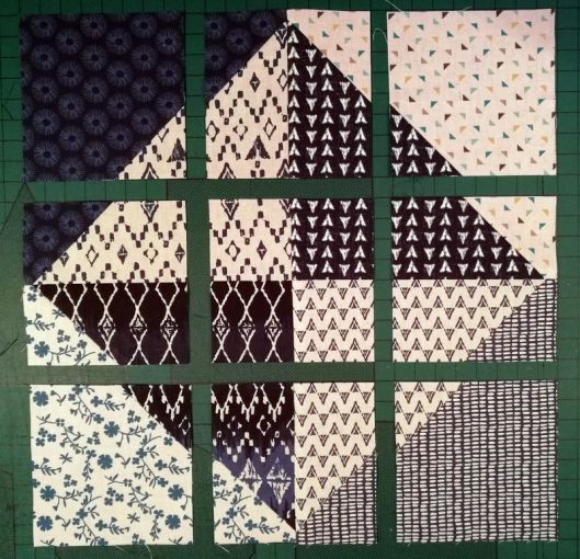 Ce bloc s’appelle le « Disappearing Hour Glass ». Jeanine l’a rebaptisé le « sablier furtif » ! J’adore le concept de ce bloc qui fait partie de la famille des « disappearing blocs » que j’avais également choisi pour mon bloc du mois de mars :