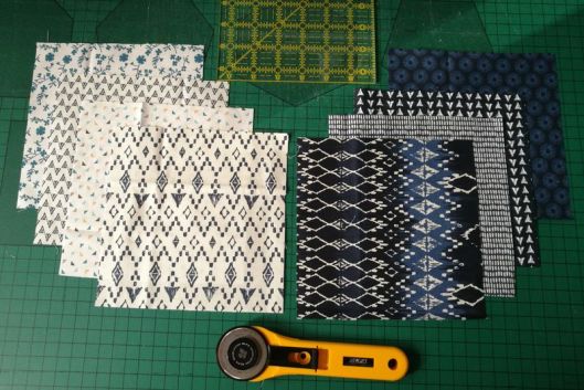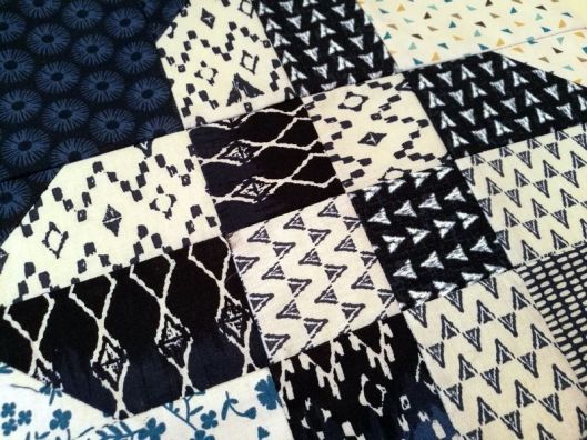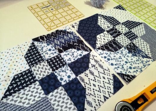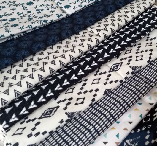 Pour ce qui est du code couleur, Jeanine voulait du bleu dans toutes ses nuances pour le tissu A et du blanc avec des motifs de couleurs bleu : du tissu qui se lit « BLANC » sans vraiment l’être et assez contrastant avec les tissus A.