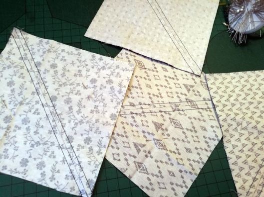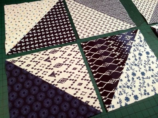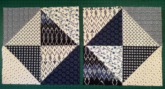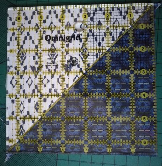 Le principe est simple ! Il suffit de positionner deux carrés (1 bleu et 1 blanc) endroit contre endroit, de tracer la diagonale puis de coudre de part et d’autre de cette ligne à 1/4 de inch :