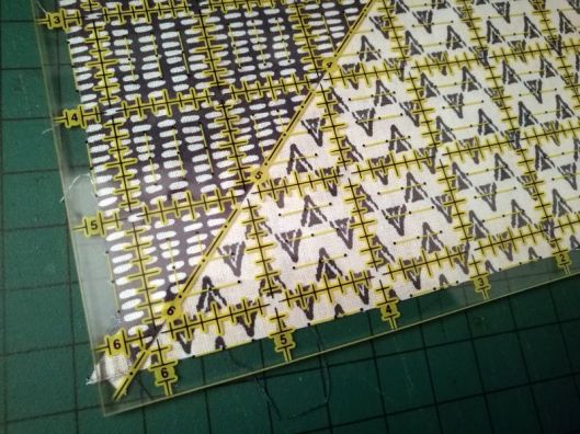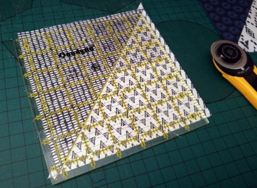 On vient ensuite recouper chaque carré pour qu’ils mesurent tous 6,25 inch (ou 6 1/4) :