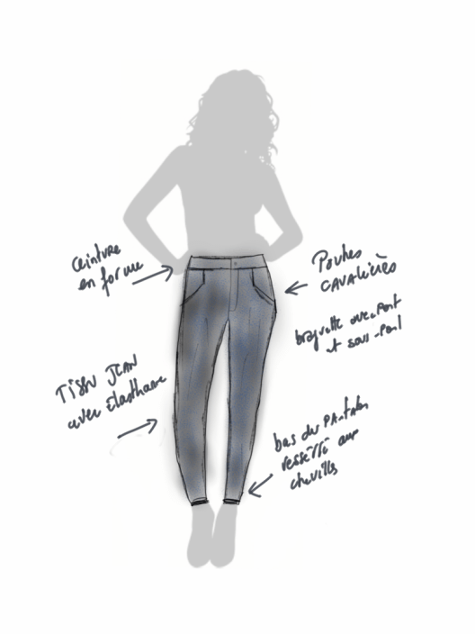 Pour ma part, je suis allée à l’essentiel : j’ai abaissé la taille pour avoir un pantalon taille basse, j’ai ajouté une ceinture en-forme, des poches cavalières (qui forment un angle), le pont et le sous-pont (braguette) :