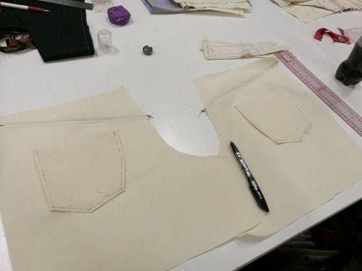 On a commencé par travailler sur le devant du pantalon, avec tout d’abord les poches :