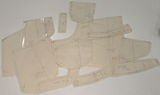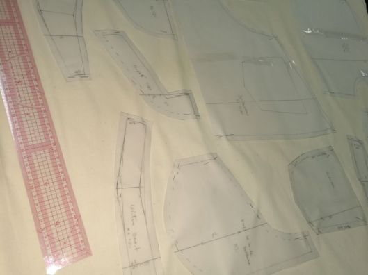 Une fois le patron réalisé et après avoir vérifié que tout coïncidait correctement, nous avons relevé toutes les pièces et les avons coupé dans de la toile (certaines se sont lancées directement dans la coupe de leur joli tissu) :