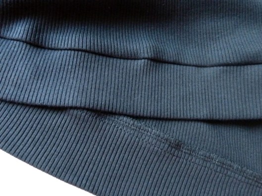 Le bas du sweat est fini par une bande qui hélas gondole… je n’ai hélas pas pu faire autrement… Je vais essayer de resserrer cette bande par la pose de la laminette sur les marges de couture…