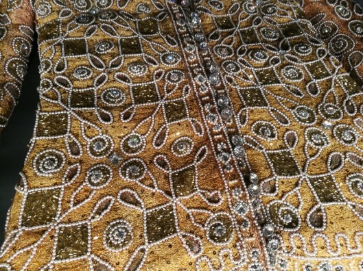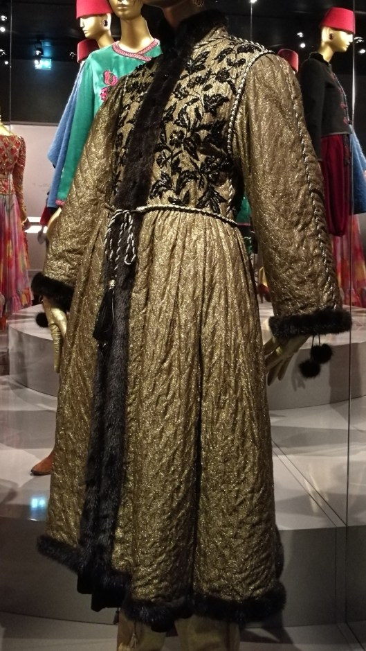 Ci-dessous, un manteau (1976) de la collection « Opéra et ballets russes » : lamé doré, brodé de perles de verre facettés et garni de vison.