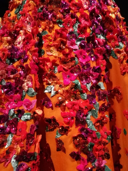 Cette cape (1989) de gazar de soie brodé d’applications de fleurs évoque les jardins luxuriants du Maroc : véritable jardin à porter sur soi !