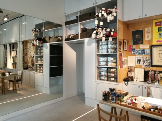 Sur la droite du bureau : un grand pan de mur est recouvert d’un miroir, véritable interface qui créait la distance nécessaire à l’appréciation du vêtement :