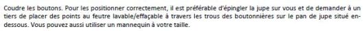 C’est une jupe dont le niveau de difficulté est 2/4 et je confirme, il n’y a pas de grandes difficultés. Je regrette juste une chose, c’est que les boutonnières et l’emplacement des boutons & des pressions ne soient pas indiqués sur la patron. Ca éviterait ainsi de faire des erreurs de placement et d’ajustement. Il est en effet indiqué sur le patron ceci :