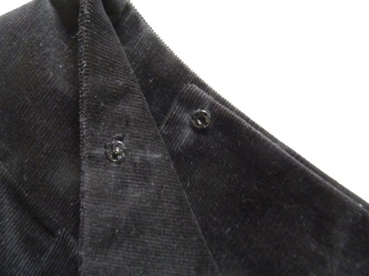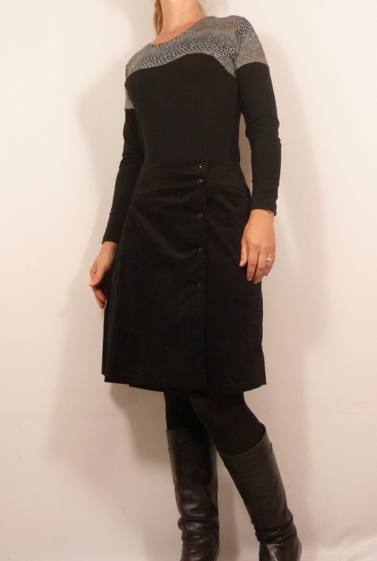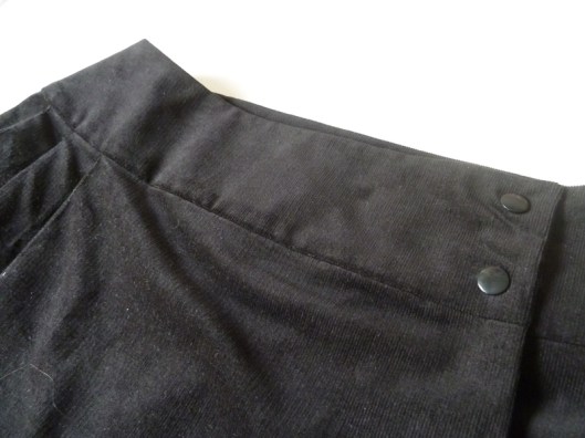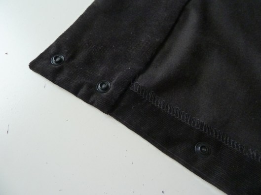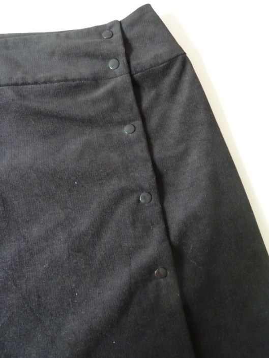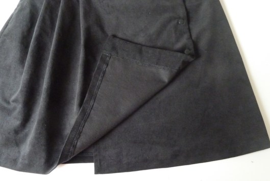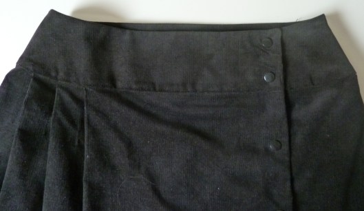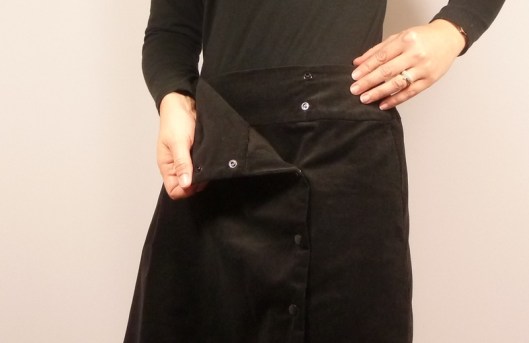 La jupe est boutonnée sur le côté gauche du devant. J’ai pour ma part poser des boutons-pressions, c’est tellement plus rapide à poser !