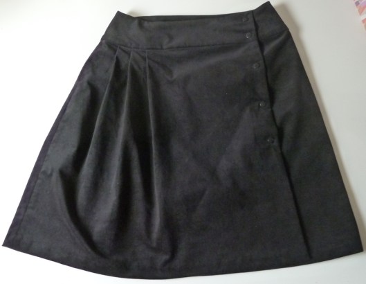 C’est en voyant la version de Tripleldemag que j’ai acheté ce patron. C’est une jupe portefeuille asymétrique avec des plis plats qui se font face d’un seul côté, sur le devant et sur le dos.