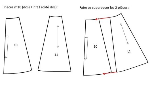 4ème et 5ème modification : plutôt que d’avoir 6 pans, j’ai décidé de n’en avoir plus que 2. De plus, j’ai réduit l’évasement que je trouvais trop prononcé à mon goût. Au final, pour la partie jupe, je n’ai plus que deux pièces : le devant et le dos. Ci-dessous, un petit schéma pour la partie jupe dos. Procédez de la même manière pour la partie jupe devant.